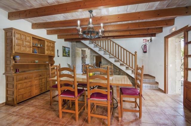 La planta baja alberga un espacio de comedor-cocina con acceso directo a una terraza cubierta, ideal para comidas al aire libre. En esta misma planta se encuentra una sala de estar con chimenea, a la que se accede a través de un arco tradicional mallorquín, así como un baño completo. Desde el salón principal, una escalera conduce a la primera planta.